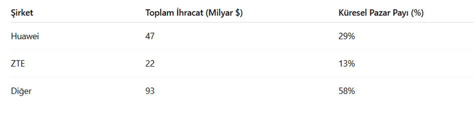 Grafikte görüldüğü gibi Huawei, Çin’in Dijital İpek Yolu stratejisinde açık ara lider konumdadır. Hem 5G altyapı ihracatı hem de dijital şehir çözümlerinde baskın bir rol üstlenmektedir.
