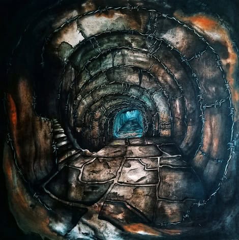 ■ Eserlerimde, insan hayatında her daim varlığını hissettiren, insanı neredeyse yaşamdan koparacak derecede güçlü olan bir takım çöküşler veya zorluklardan yola çıktığımı belirmeliyim. Bazı Çalışmalarım da mağara görüntüsünün baskın olduğunu gözlemleyebiliriz. Bunu ele alacak olursam, insanların hayatlarındaki çöküş dönemlerini mağara ile tasvir ediyorum. Mağaralar dış mekâna karşı koruma kalkanı görevini görüyor ve dikenli teller de bu görevin en temelini oluşturuyor. Her ne kadar dikenli teller bireyin içerisinde sıkışıp kaldığı dünyasının sınırlarını ifade ediyor kasvetli bir mekânla bunu tasvir ediyor olsam da karanlıkta bile umudun var olduğuna inandığım bir yolculuk olarak tanımlayabilirim.