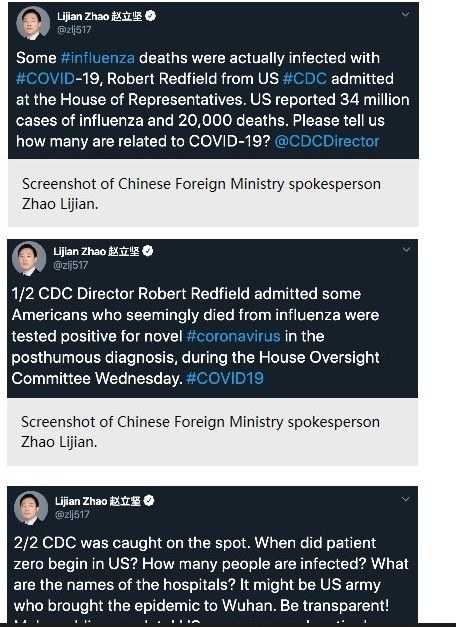Çin Dışişleri Bakanlığı, CDC den Robert Redfield’ın, virüsün ABD kaynaklı olabileceği yönündeki açıklamalarına dayanarak virüsün ABD orjinli olabileceğini üstü kapalı ima etti.