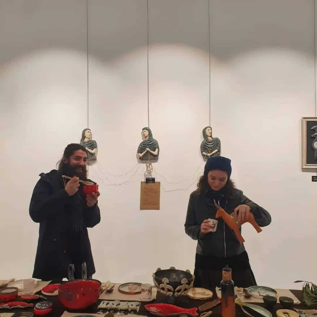 Sergide ilk göze çarpan unsur, Anadolu uygarlıkları ile harmanlanmış bir sofraydı… Uzun bir masanın etrafında, M.Ö 7.400’lere uzanan Çatalhöyük evlerinin beyaz sıvalı duvarlarındaki av sahnelerinden oluşan altın işlemeli fincanlar, 12 bin yıllık Göbeklitepe’nin sırlarını kazıdığı tabaklara eşlik eden, Hititlerde içki kabı olarak kullanılan riton ve Hititlerin tören sunu kaplarından esinlenerek tasarlanan boynuzlu sunu kabı yer alıyordu. Uçtan uca Anadolu tarihine tanıklık etme şansı yakaladığımız bu masada, Alacahöyük idollerinden, Boğazköy bayram törenlerini özümseyebileceğimiz, dans eden kadın figürüne, balık biçimindeki figüratif tabaklar ile Minos ve Girit kıyılarının deniz kokusunu ruhumuza dolduran, birbirinden özel eserleri görebilmek mümkündü.