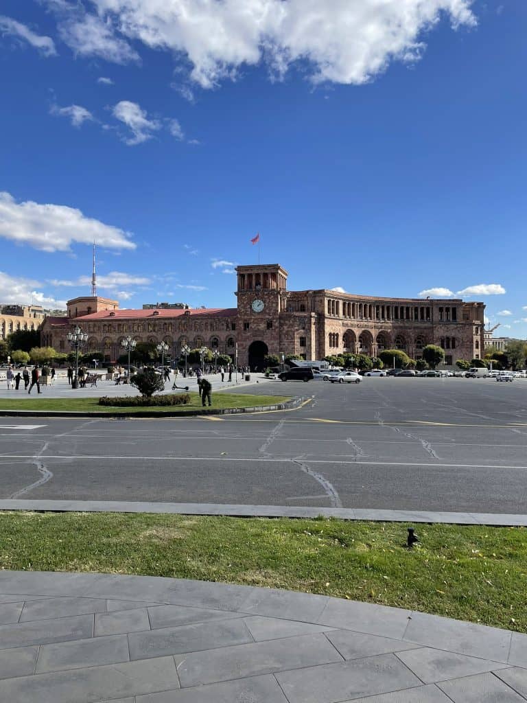 Erivan, Gümrü’nün aksine tam bir büyük şehir havasındaydı ve bu durum şehre ayak bastığımız ilk andan itibaren kendini hissettiriyordu. Binalar daha yüksekti ve geniş bulvarlar göze çarpıyordu. Yine de binaların renkleri değişmemişti. Gümrü’deki pembe-kahve-gri tonlu taşların aynılarıyla yapılmışlardı, yalnızca daha büyüklerdi. Ermeni şehir mimarisini, Cumhuriyet mimarisine, Ankara-Ulus’taki binalara fazlasıyla benzettim. Şehrin girişinde Hrant Dink’i anma etkinliğinin afişleri karşıladı bizi.
