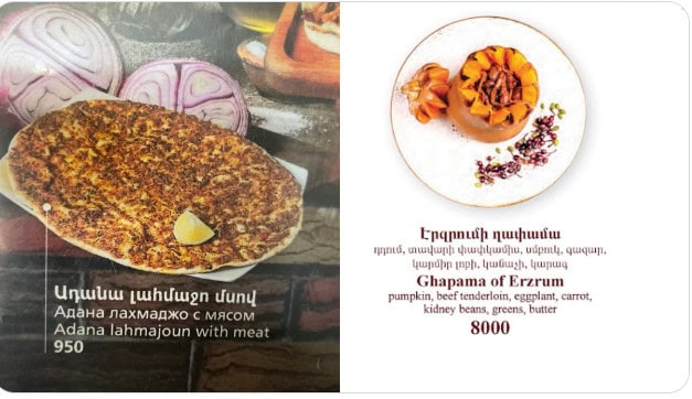 İnsanlar bize çok benziyor. Esnaf, bize kayısılı şekerleme ve nar suyu satabilmek için seferber oldu. Sırf o ikramlar bile karnımızı doyurmaya yetti. Zeytin tezgahlarında Marmara-Birlik zeytinleri gözümüze çarptı. Oradan sonra gittiğimiz lokantada da bizi güzel sürprizler bekliyordu. Yemek isimleri yine çok tanıdıktı: lahmajo, dolma, gapama Erzrum, imam bayaldi. Lahmacun ve Kilikya birası söyledik, sarımsağı boldu ve tadı Antep lahmacun gibiydi. Ertesi gün Adana Ermenilerinin lokantasında yediğimizdeyse menüde “Adana Lahmajo” ifadesiyle karşılaştık.