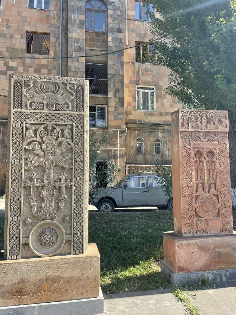 Ermeni alfabesi 5. yüzyılda ortaya çıktığı için içerisindeki yazılar Yunan harfleriyle ancak Ermenice olarak yazılmış. Sütunların yanında Arap akınlarından kalma Arapça yazılar, tapınağın yakınındaysa Roma döneminden kalma bir kilise ve hamam da bulunuyor. Tapınağa yaklaşık 20 dakika uzaklıkta bulunan Geghard Manastırı da mutlaka görülmesi gereken yapılardan. Mağara ile iç içe kurulmuş olan manastırın işlemeleri göz kamaçtırıcı. Ermenistan’da hemen her yerde, özellikle de kiliselerin yakınlarında görebildiğiniz, anıtsal taş yapılar var. Bu yapılara “kachkar” deniyor. Bu yapılar, taşa oyulmuş bir haç ve çevresinde toplanan çeşitli desenlerden oluşuyor. Önce mezar taşı olarak kullanılmış olan kachkarlar, daha sonra önemli bir sembole dönüşmüş ve ülkenin dörtbir yanına yayılmış. Sayıları yüzbinlerle ifade ediliyor olsa bile her biri birbirinden farklıymış. Bire bir aynı olan iki kachkar bulmak imkansızmış.