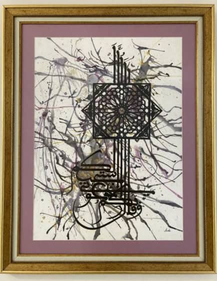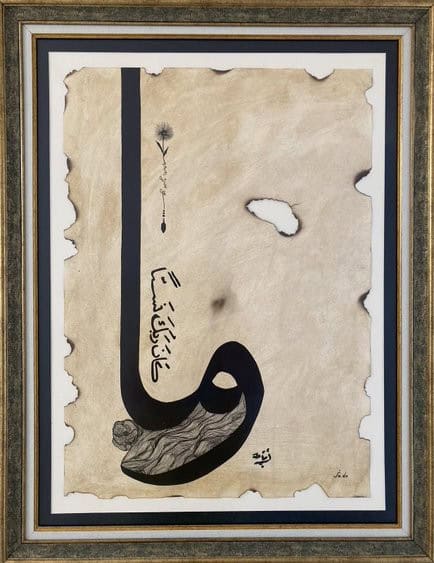 Jade Sevgi Aynacı adlı sanatçımız da bizi Osmanlı Dönemi’nden bir esinti olan hat sanatı ile buluşturuyor. Farsça yanıp tutuşmuş anlamına gelen “Şuride” adlı çalışmayı aharlanmış kağıt üzerine uygulamıştır. Kağıdın yanmış bir görünüm kazandırmak amacıyla deforme edilmesi de “Şuride” adının hakkını tam olarak vermiştir. “Nazende” adlı bir diğer eser ise, karışık teknik ile hat sanatını bir araya getiren, son derece büyük bir emek harcanarak meydana getirilen bir eserdir.