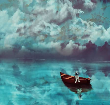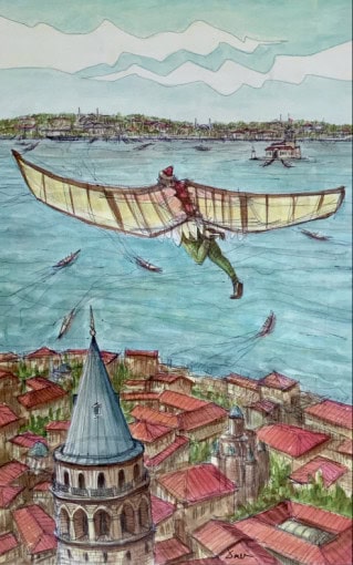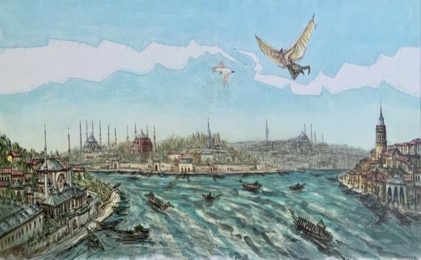 Bir kent ressamı olan Ömer Faruk Boyacı ise bizi 17. yüzyıla doğru uçuruyor. Hezarfen Ahmed Çelebi’nin Galata’dan Üsküdara’a uçuşunu özgün bir çizimle resmeden sanatçı, İstanbul’un 1600’lü yıllardaki kent dokusunu gözler önüne seriyor. “Galata’dan Üsküdar’a” adlı eserinde geniş açıdan İstanbul’un adeta tarihi topoğrafyasını çıkartan genç ressam, her iki eserinde de son derece ferah hissetmemizi sağlayacak renk tonları tercih etmiş. Bu da henüz o dönemlerde İstanbul’un nefes alınabilir halini de bize başarılı bir şekilde vurguladığını gösterir. kuşbakışı görünen kentin sokaklarına indiğimizde, her an karşımıza fesleriyle, Süleymaniye Külliyesi civarında birikmiş kalabalık, kahvehanelerde toplanmış insanlar çıkacakmışçasına bir his ile resme uzun uzun bakma ihtiyacı duyuyoruz.