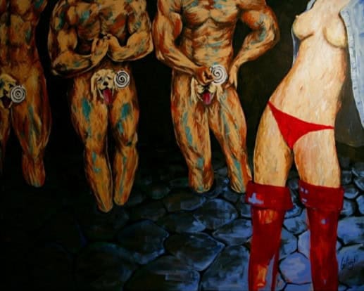 Gülbuğ Mukaddes Kılınç, Erkek hegemonyasına karşı sağlam bir duruş sergileyen “Siz Kendinizi Ne Sandınız” adlı eserinde vücut yapısı olarak son derece gelişkin görünen erkeklerin kadın vücuduna yenilişi işlenmiştir. Güçlü görünme çabasının eril egonun arkasına sığınmak ve acizliği örtmek için bir zorlama olduğunu gözler önüne sermiştir.