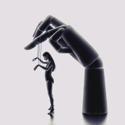 Nur Ernehir’in foto manüplasyon tekniğiyle oluşturduğu “Kuklalar” adlı eserde kuklayı tutan elin son derece robotik oluşu, hızla makineleşen dünyada artık insanın mı makineleri yoksa makinelerin mi insanları yönettiğini yoksa tüm dünyayı tek bir aklın mı yönettiğini sorgulamamıza neden oluyor. Bunun yanı sıra kuklanın ya da kuklalaşmış insanın iplerini tutuş biçimi de oldukça manidar.