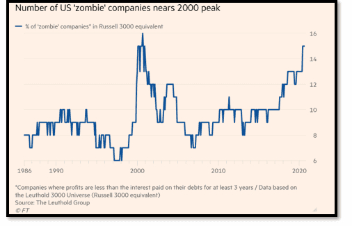 ABD için FT araştırmasındaki rakamlara bakıldığında zombi şirketlerin oranı 2000 yıllarındaki sayılara eşdeğer bir orana yaklaşmış durumda. Bu aynı zamanda son 20 yılın da en yüksek oranı olarak görülüyor. Koronavirüsün başlaması ve bu sebeple merkez bankalarının sert para politikası tepkileri sonucu bu zombi şirketlerin sayılarının artmasına sebeb olduğu da görülüyor. Her geçen gün daha fazla şirket borçlanıyor ve zombi şirketlerinin sayısı artıyor. Sermaye piyasaları aniden kurur ve borçlarını yeniden finanse edemez veya ödeyemezlerse ne olur sorusu bu durumda aklımıza geliyor. Faiz giderini nasıl devredecek veya hatta karşılayacaklar? Bu sorulara verilen cevapları da açıkçası çok tatminkar bulmuyorum. Dot.com krizinde de benzer bir yapıya ulaşan zombi firmaların yine aynı şekilde yüzdürülmesi durgunluk halinde büyük bir tehlike arz ediyor.